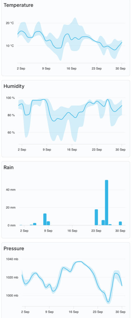 Autumn kicked in with a vengeance soon after the equinox on 21st, and the last week was very wet, windy and depressing. The two wettest days were the 23rd (18.1mm) and 26th (51.1mm). The total on the 26th ranks with some of the wettest days i’ve recorded in Durham. It was the wettest day since 17th November 2022.